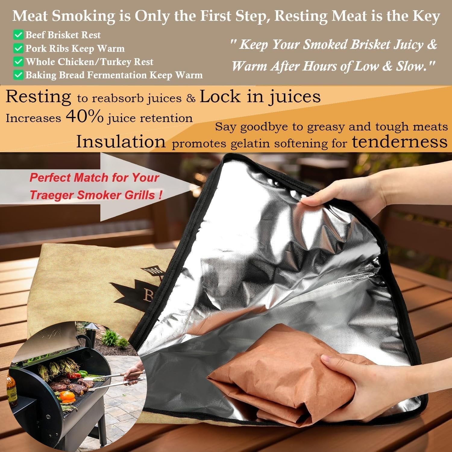 🔥 Essential BBQ Accessory for Perfectly Rested Meat: Take your smoking game to the next level! Whether resting brisket, pork ribs, or turkey, this insulated bag keeps your meat tender, juicy, and bursting with smoky goodness.