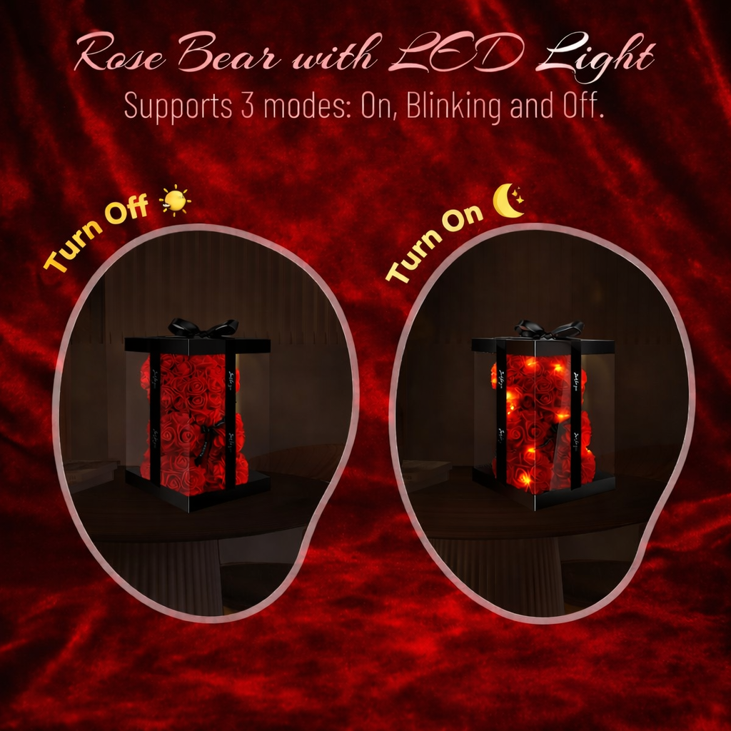 The Eternal Rose Bear transforms nearly 200 handcrafted roses into an adorable keepsake that lasts for years. Unlike real flowers that wilt in days, this forever bear stays beautiful with zero maintenance. Watch her face light up when she sees the magical LED glow for the first time.